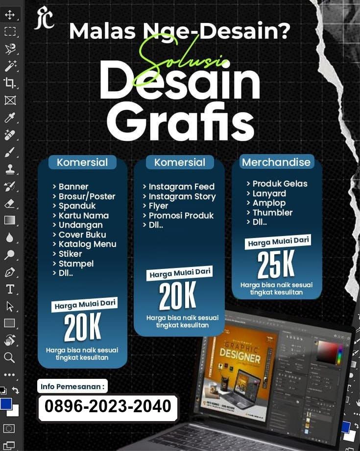 Kami menyediakan jasa desain grafis profesional untuk kebutuhan promosi, media sosial, hingga branding bisnis. Mulai dari banner, poster, feed Instagram, hingga merchandise, semua kami kerjakan dengan desain rapi, kreatif, dan harga terjangkau mulai 20 ribuan. Cocok untuk UMKM, bisnis online, maupun kebutuhan personal.